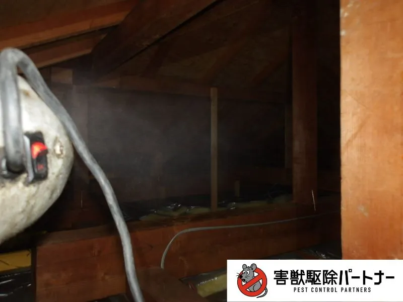 ネズミの体にはダニやノミなどが付着しており、ネズミが死亡すると他の寄生先を探して人間に被害が出る可能性があります。特に住宅内や屋根裏などでネズミが死亡すると、こうした2次被害が起こる可能性が高いため、殺虫用の薬剤を噴霧していきます。