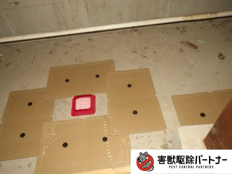 1日目の最後に、ネズミ専用の粘着シートと毒エサを設置します。ここまでの作業で基本的にネズミの追い出し、再侵入の防止などは行っていますが、ネズミが潜んでいたり穴が空いている状態だとネズミが再度屋根裏に現れる可能性があります。そのため作業の最後には、こうして粘着シートと毒エサを仕掛けます。