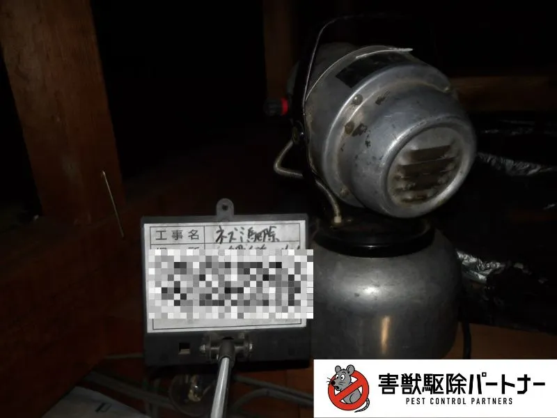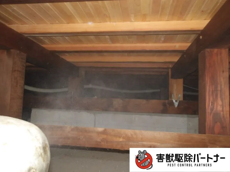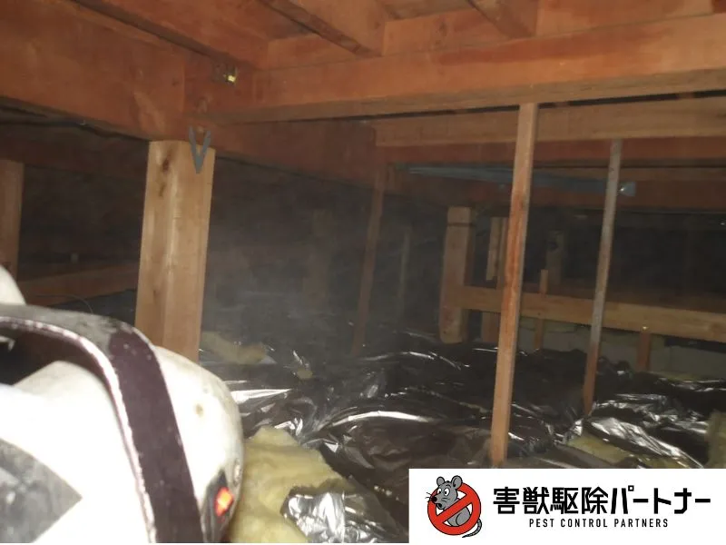 工事のご契約後、まずはネズミの追い出し作業からはじめます。ネズミが嫌がる成分を含んだ薬剤を屋根裏や床下など噴霧していきます。