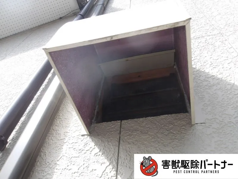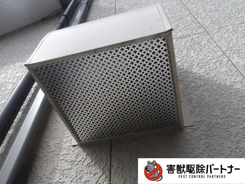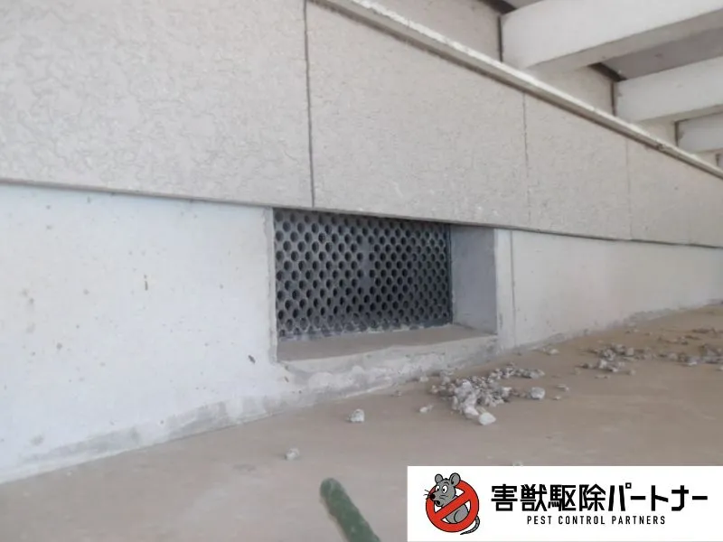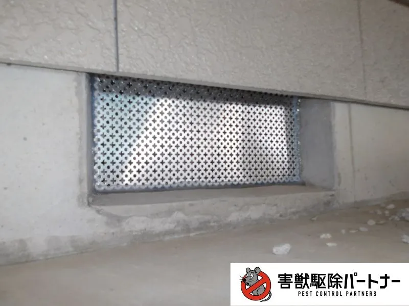 追い出し作業でネズミがいなくなった後は、ネズミが侵入している穴を塞ぎます。今回の現場では床下の通風口や換気扇の排気口の穴などを塞ぎます。