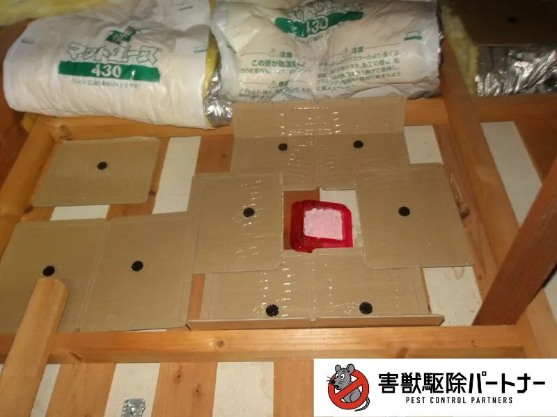 続いてネズミのフン清掃や、粘着シート・毒エサの設置を行います。粘着シートは2日目の施工まで置いておきますが、今回の住宅では粘着シートにネズミが捕まっていました。(※実際の画像は本事例の詳細な事例ページに掲載しています)