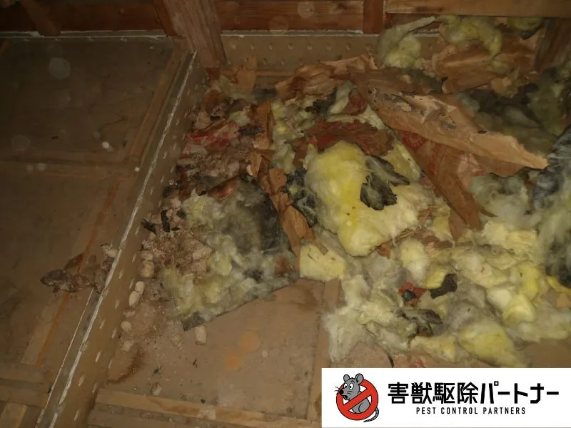 屋根裏で動物の足音がするとの事で調査依頼を頂きました。点検口を作成し屋根裏を確認すると、荒らされた断熱材とハクビシンのフンが発見されました。