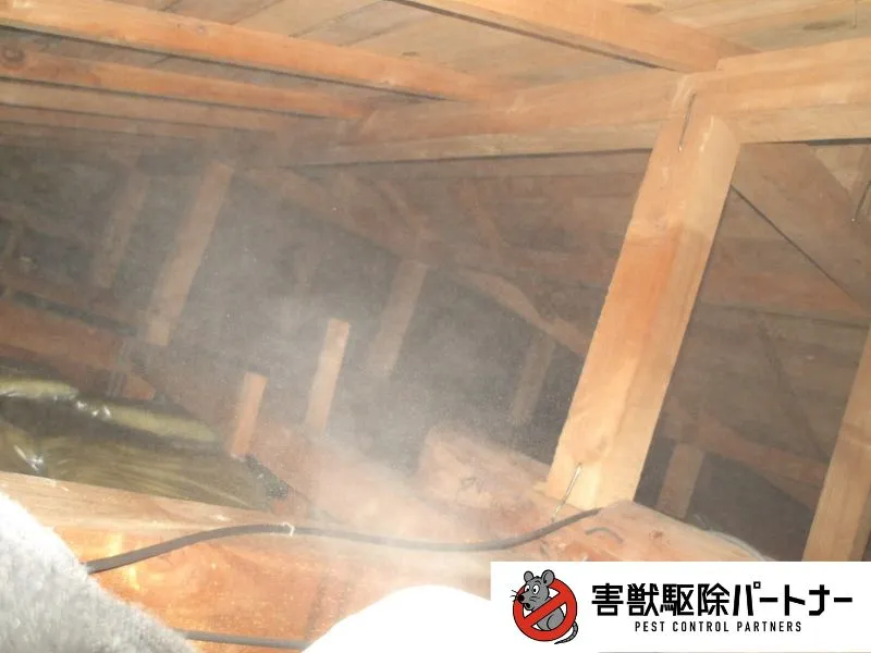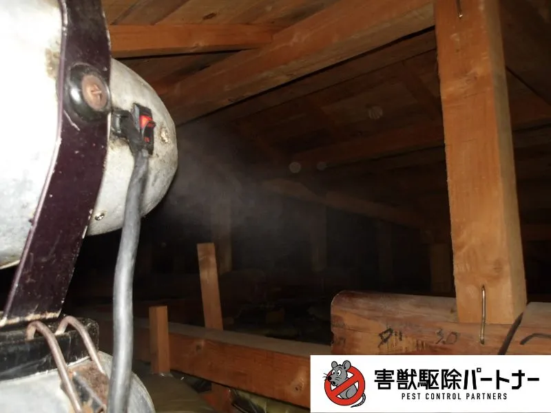 後日、工事のご契約を頂きましたので作業を行います。ネズミ駆除ではまず追い出し用のネズミが嫌がる薬剤を噴霧していきます。