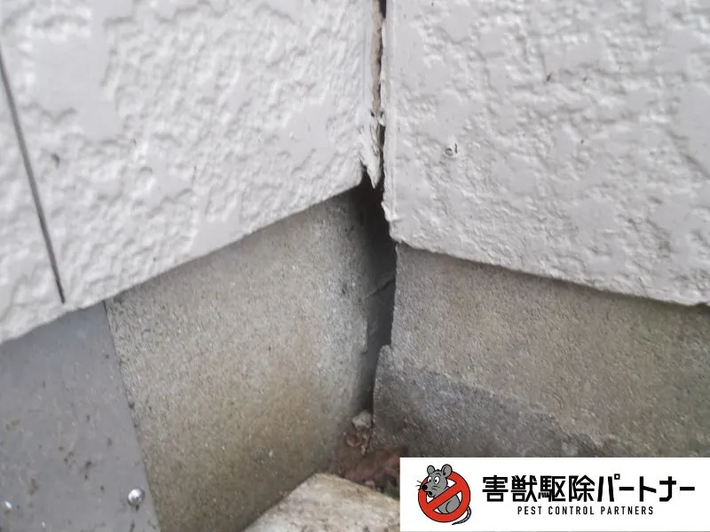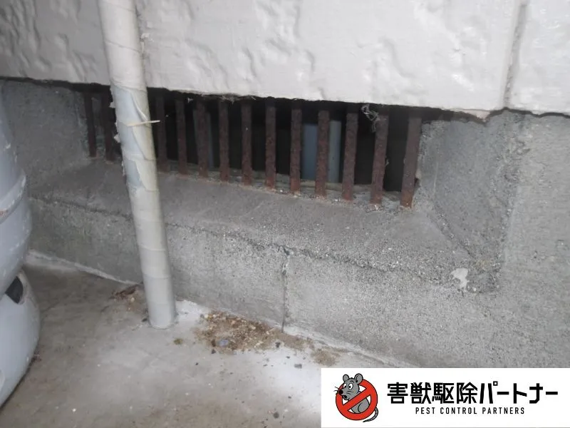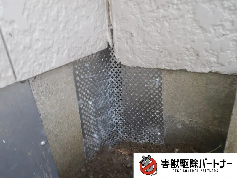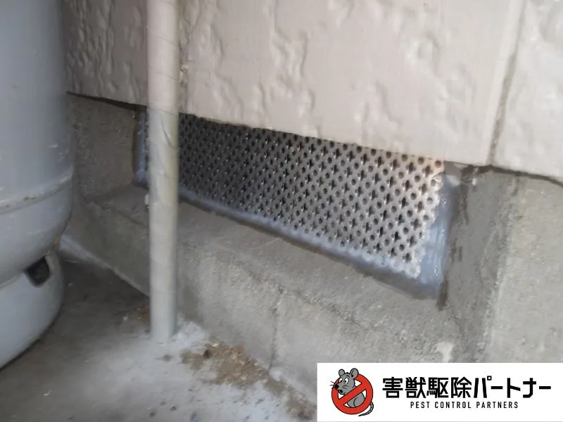 続いてネズミが侵入していると思われる穴を塞ぎます。今回の住宅では床下の通風口や基礎の隙間などを塞ぎました。