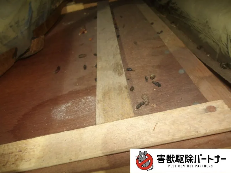 屋根裏からカリカリという音がするとの事で調査を行うと、屋根裏でネズミのフンを発見致しました。