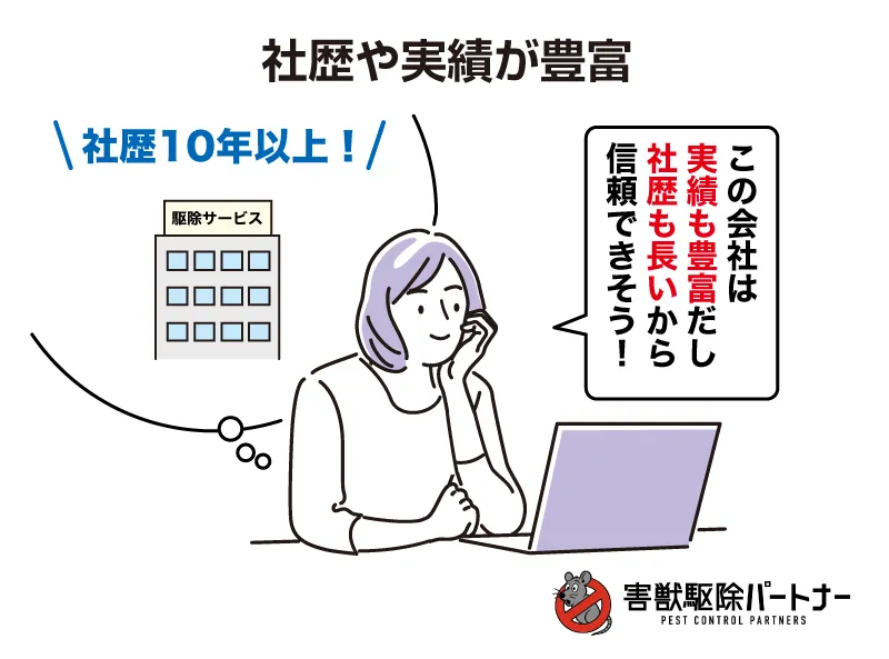 そのため、豊富な実績に加えて社歴が長いのかも重要なポイントの一つです。目安として最低でも5年、できれば10年以上の社歴がある会社を選ぶようにしましょう。