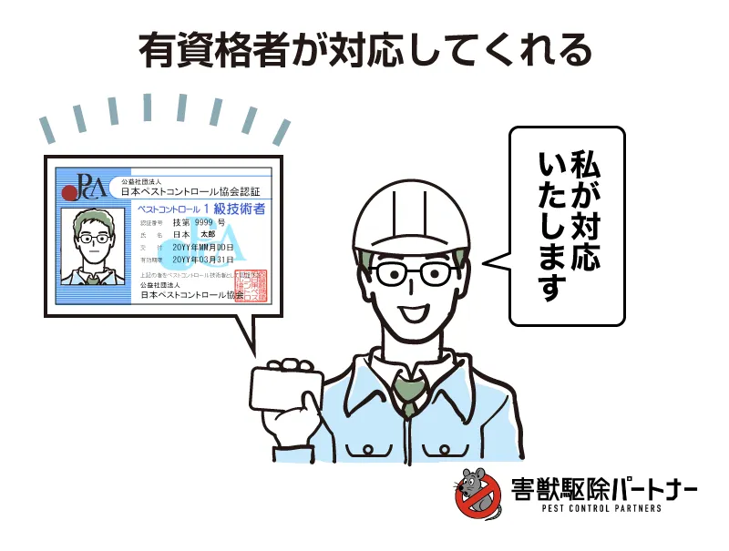 害獣駆除の業界には、害獣の生態や駆除方法に精通した証である資格が複数存在しています。主に、この記事のはじめに紹介した日本ペストコントロール協会が発行するもので、こうした資格を持っていれば害獣駆除に精通したスタッフである事の証明になります。