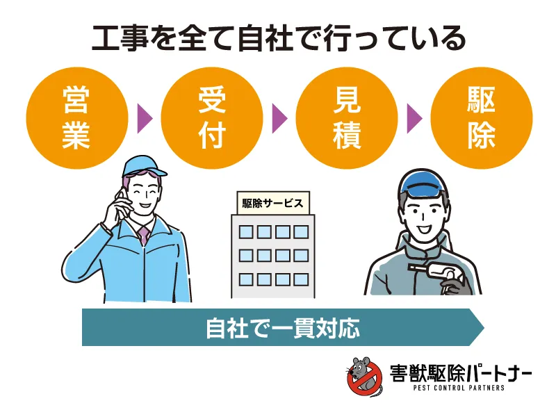 害獣駆除を依頼する業者が、受付から工事までを全て自社で行っているのかを確認しましょう。害獣駆除業界では、営業活動だけを行い実際の作業は下請け業者に丸投げする営業代行のような会社も存在します。