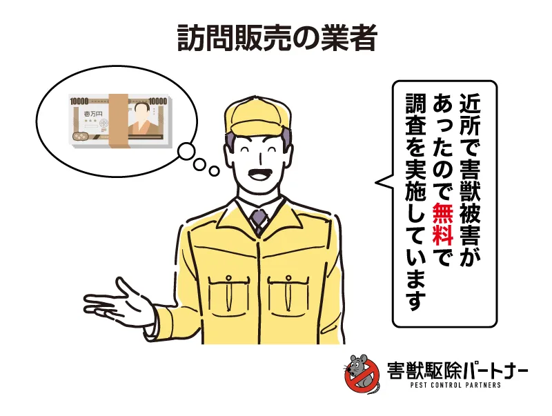 害獣駆除の業界では、訪問販売によって収益を上げている業者も存在します。もちろん全ての訪問販売業者が悪いという訳ではありませんが、悪徳業者はかなりの高確率で訪問販売を行っています。