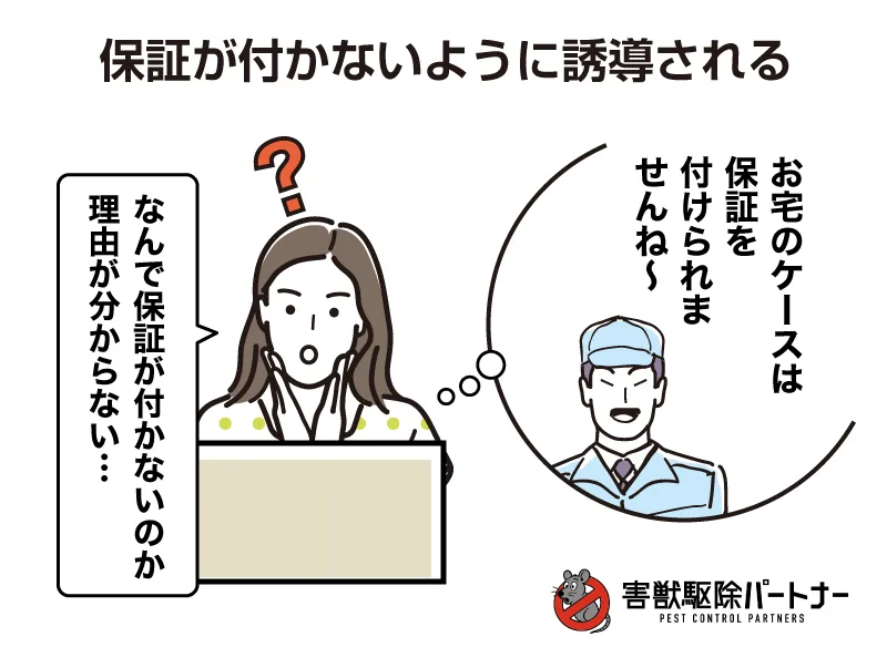 害獣駆除業者の中には、ホームページ上では長期保証などを謳っているにも関わらず、いざ調査や工事を行うと何かと理由を付けて保証を付けられないように誘導する業者も存在します。