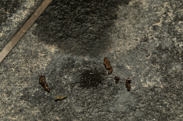 ネズミの糞:硬くて潰れにくい、あるいは粘土のような粘り気がある。(主食が穀物などのため、密度が高い)