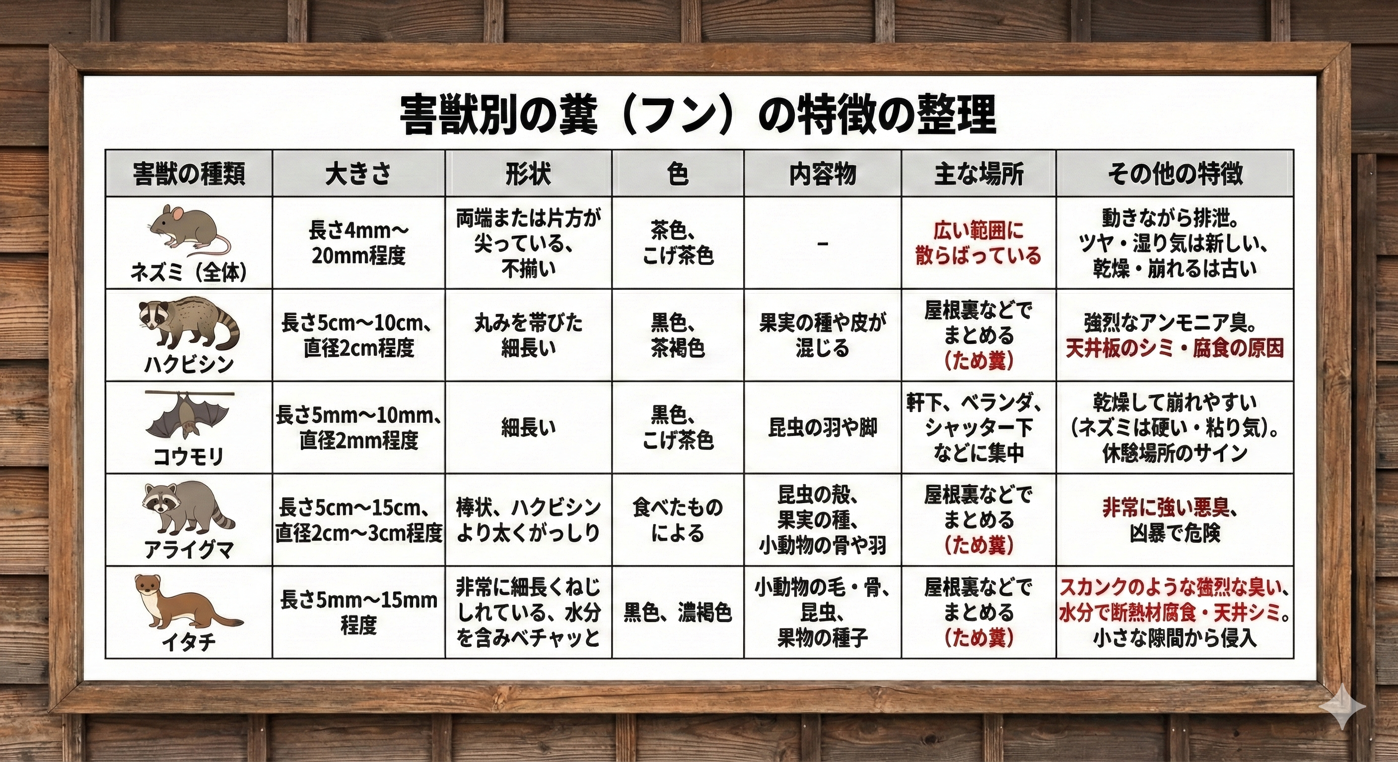 ここでは、それぞれの害獣が残す糞の特徴を詳しく解説します。