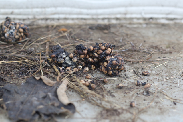 内容物: ネズミなど小動物の毛や骨、昆虫の残骸、果物の種子が混ざっている